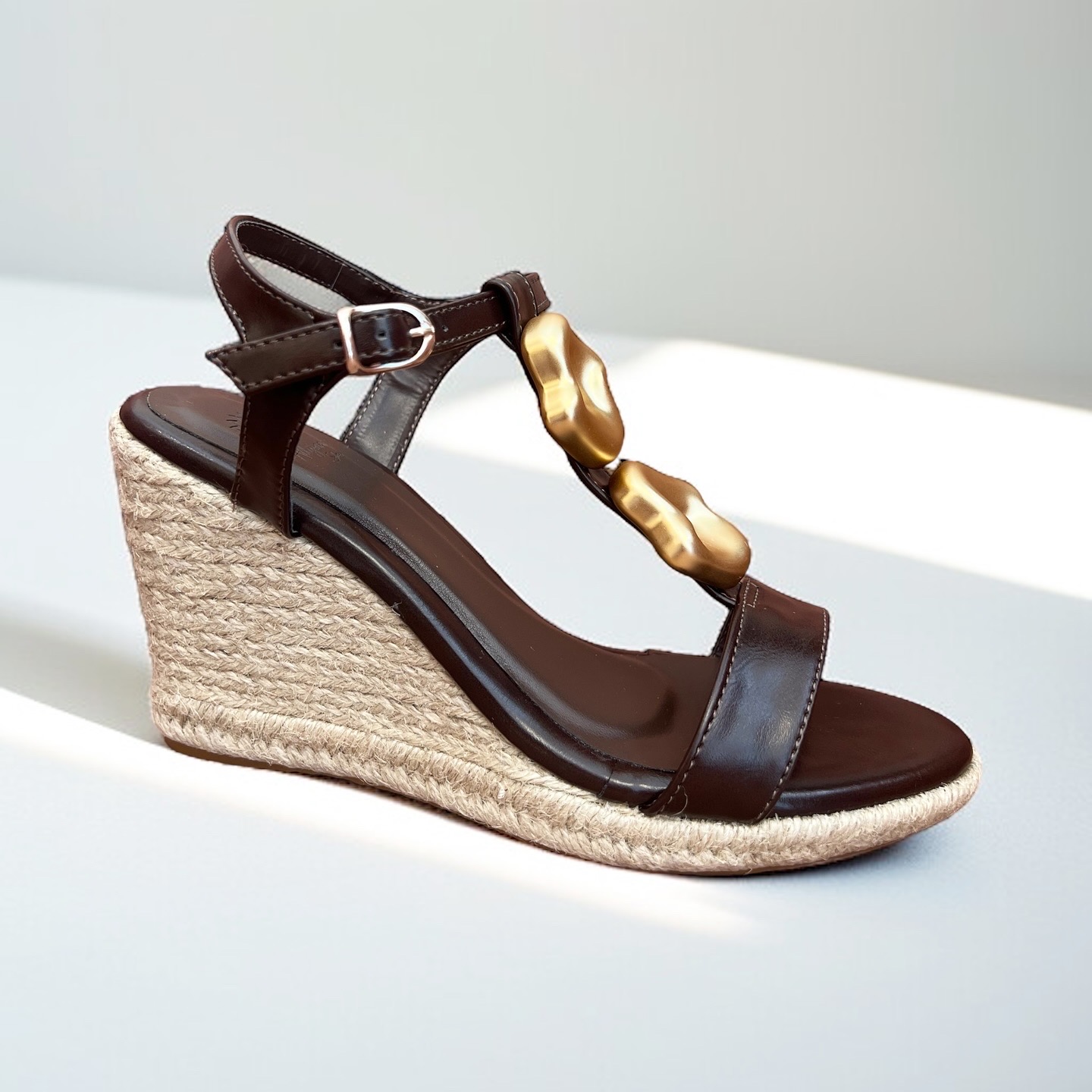 Sandália anabela marrom, com salto revestido em corda e enfeite orgânico dourado no cabedal.