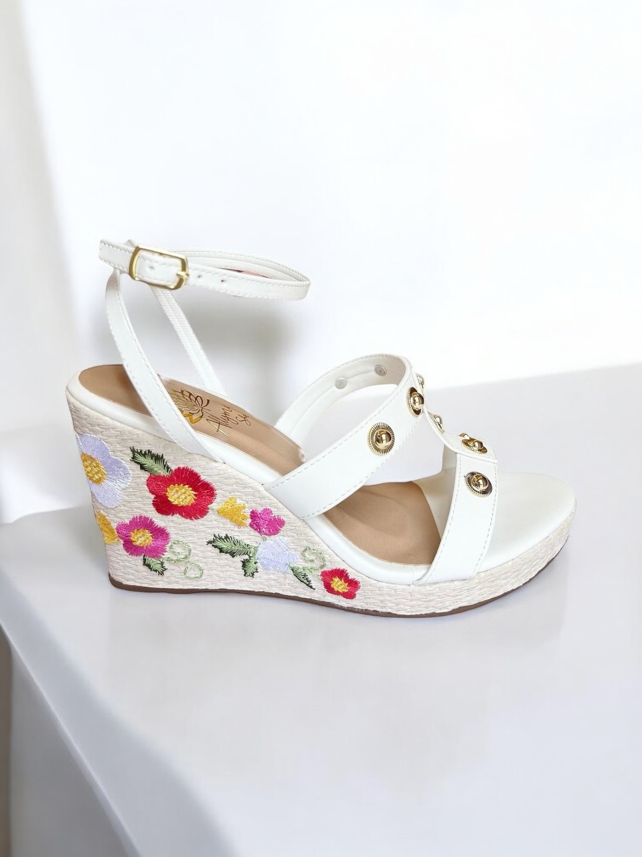 Construções indispensáveis, os modelos anabelas traz o ápice para a temporada. O modelo é produzido em material tecnológico no tom branco. Possui bordado florais no salto e rebites dourados nas tiras do cabedal.. Fechamento por fivela de ajuste no tornozelo.
