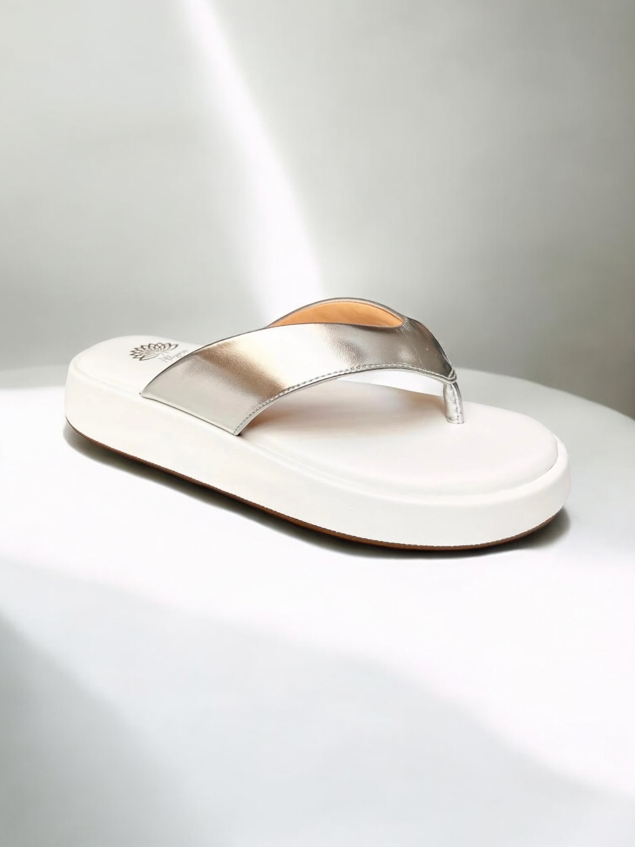 Os chinelos pilloy thongs carregam uma tendência que vem se consolidando cada vez mais, tiras em materiais macios com uma pegada ultra feminina e moderna que equilibra feminilidade e conforto com uma silhueta exuberante. O modelo é produzido em material tecnológico no tom branco e tira prata, possui tiras macias, palmilha anatômica e solado flatform.