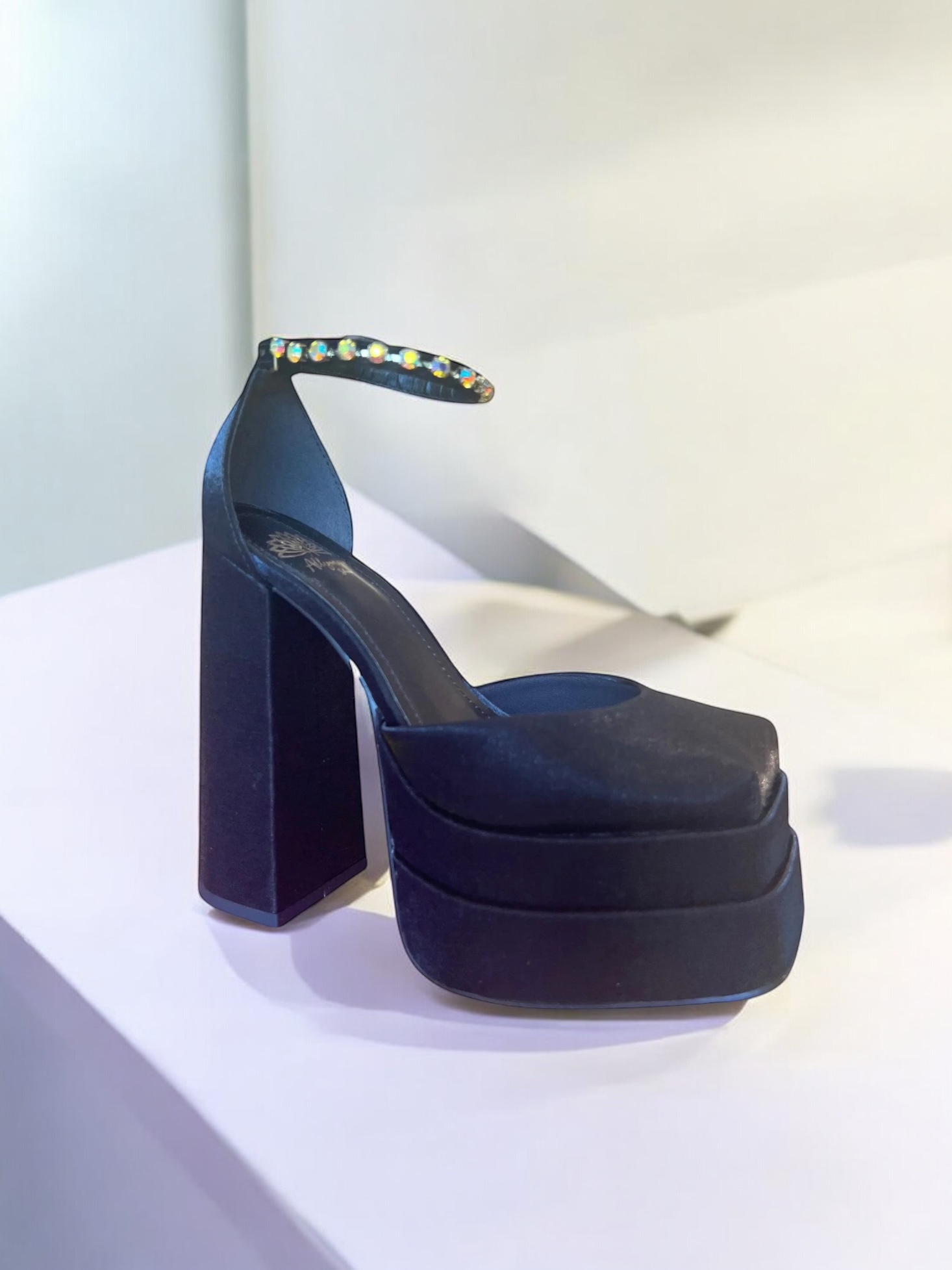 A sandália Allyma Shoes da Coleção Divando possui um salto em bloco alto, e abusa da tendência ao apresentar uma plataforma dupla . O modelo do sapato tem bico quadrado e, nas alças, há aplicação de pedras furta cor e toda a sandália apresenta um acabamento em cetim de extrema qualidade, a palmilha, solado e acabamento interno todo em preto.