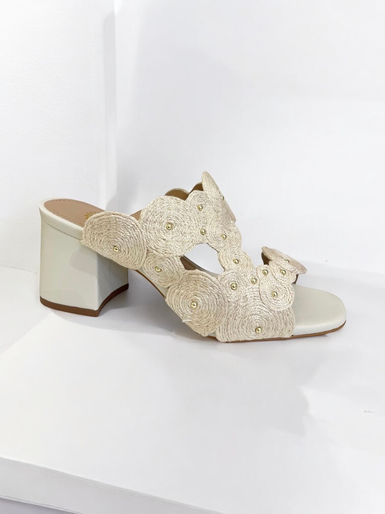 Em um mix perfeito entre a elegância minimalista e a leveza do boho, essa sandália é a escolha ideal para o verão. O modelo produzido em material tecnologico com um design em espiral por toda a peça e rebites metalizados. Possui bico levemente quadrado, salto médio bloco. Fechamento por amarração (a tira de amaração pode ser removida).