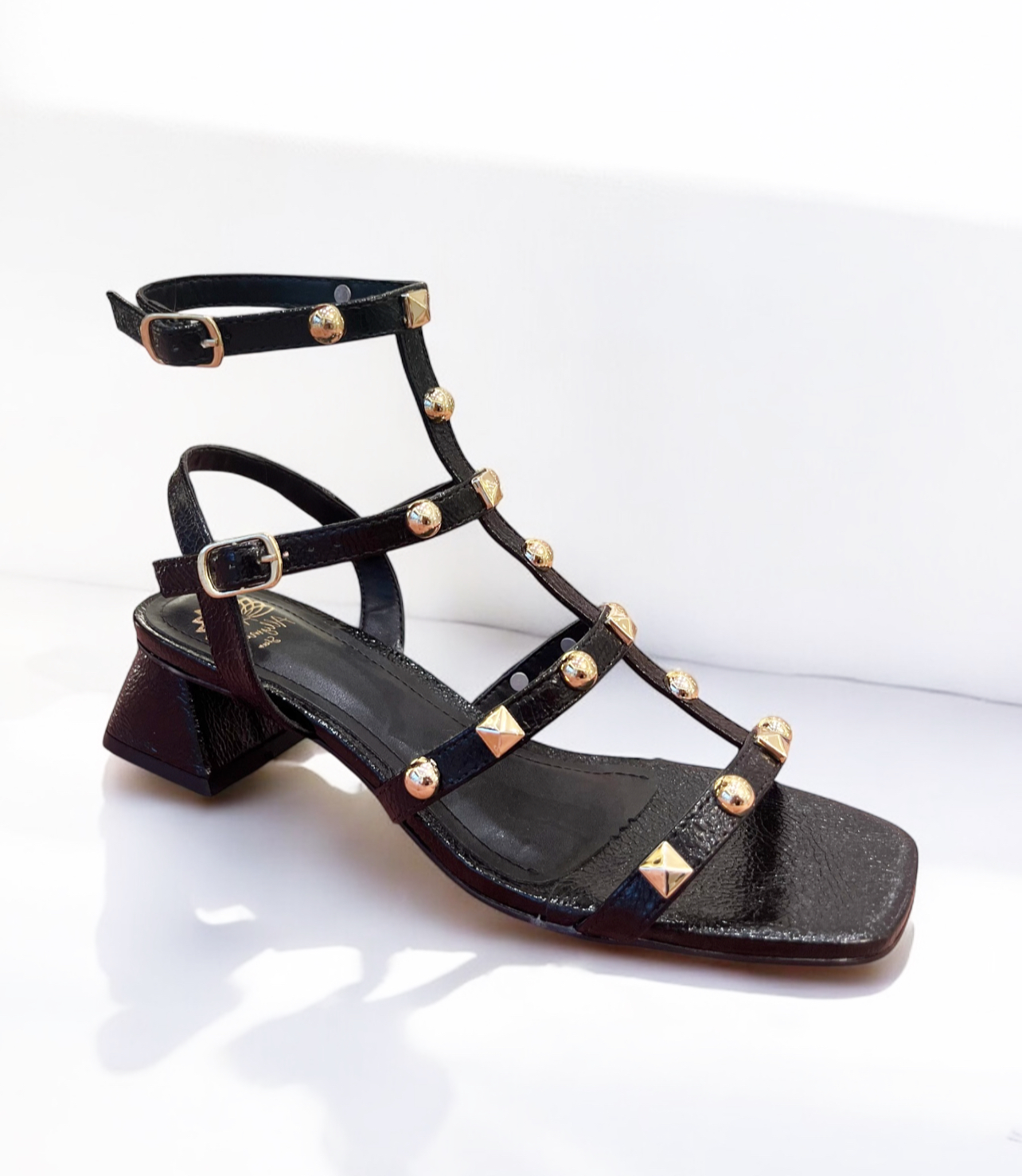 Perfeita para compor looks versáteis e estilosos, a nova sandália Catarina vai trazer sofisticação e conforto para suas produções! O modelo é produzido em material tecnológico no tom preto e possui tiras adornadas por pirâmides metalizadas. Possui salto baixo bloco e fechamento por fivela.