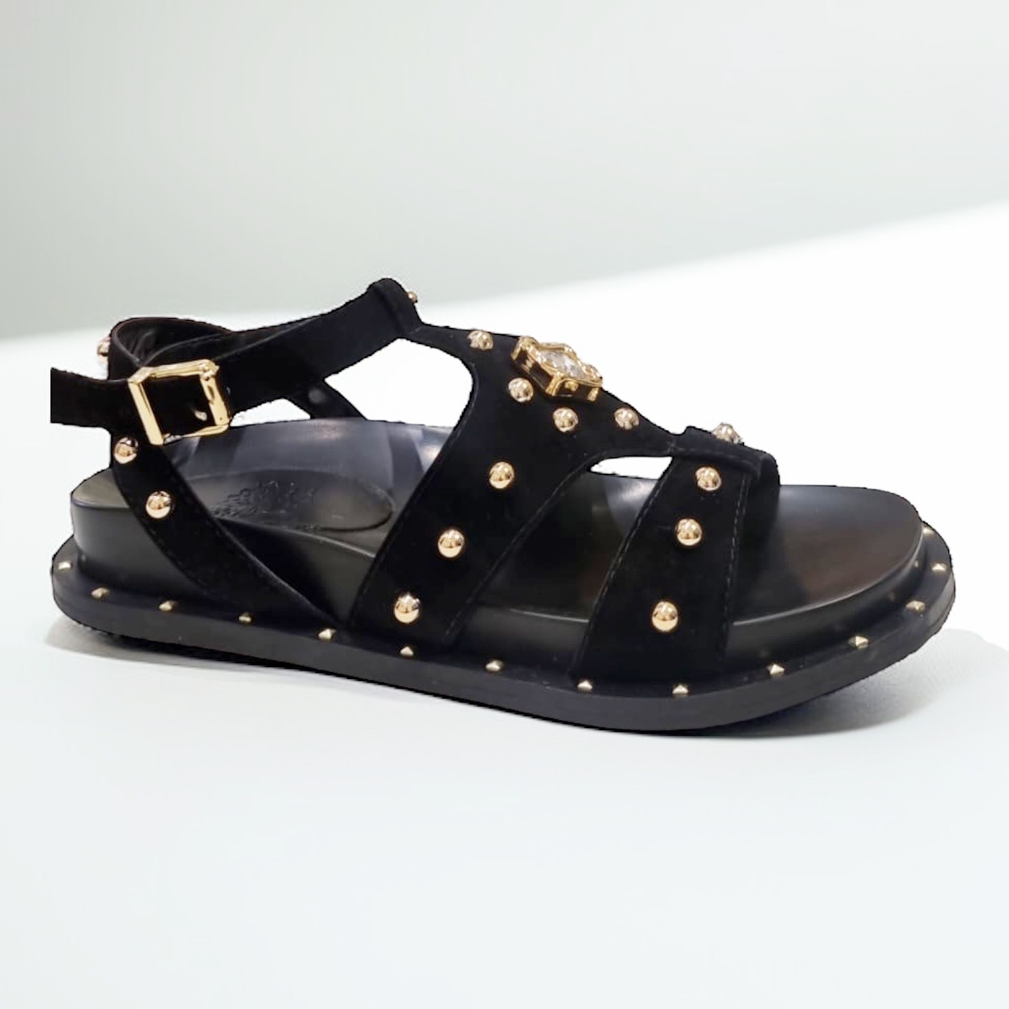 Elegância atemporal: sandália preta com aplicações douradas que transformam conforto em luxo. Um toque exclusivo Allyma Shoes para seus melhores momentos.