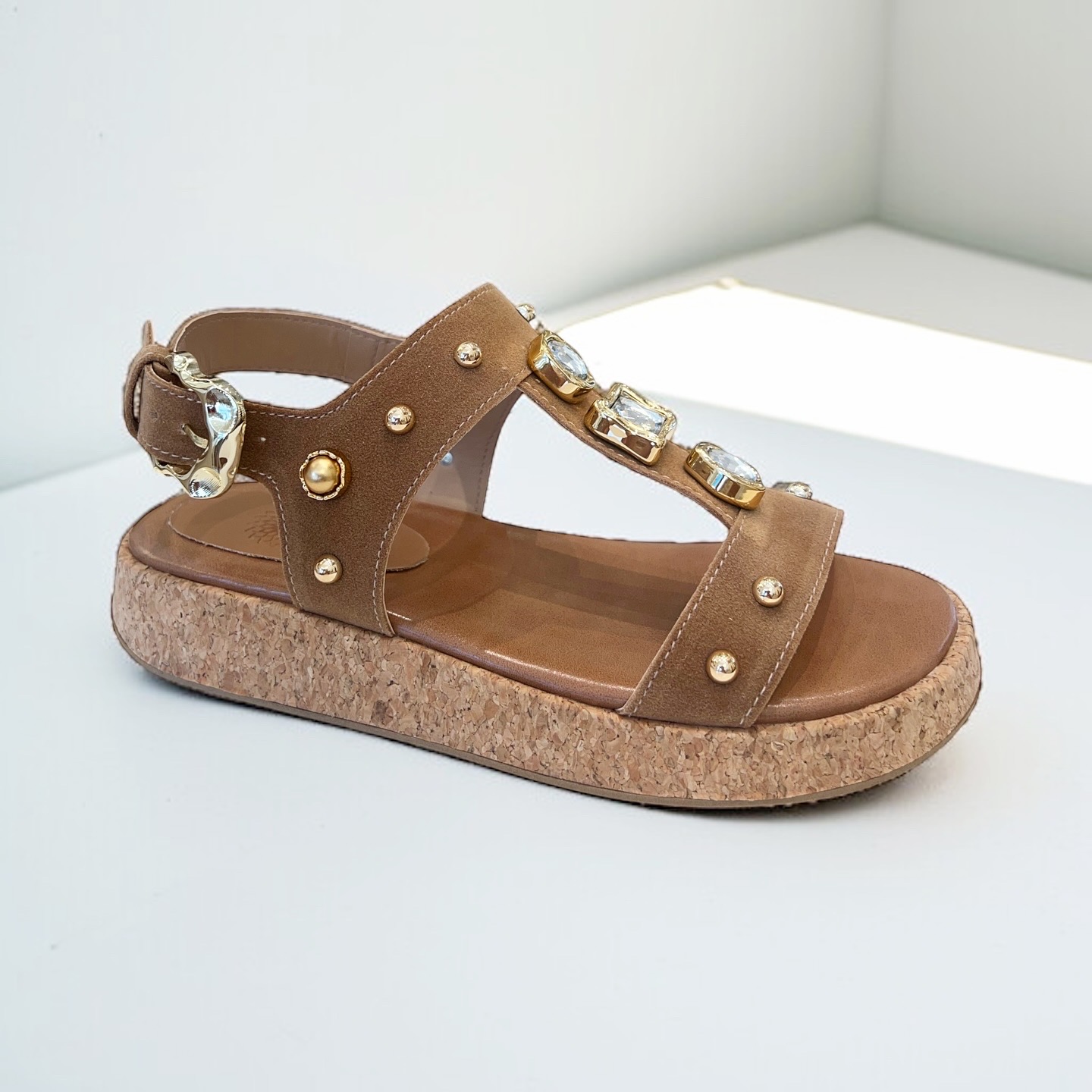 O luxo em versão casual: sandália caramelo com pedrarias e detalhe em cortiça.