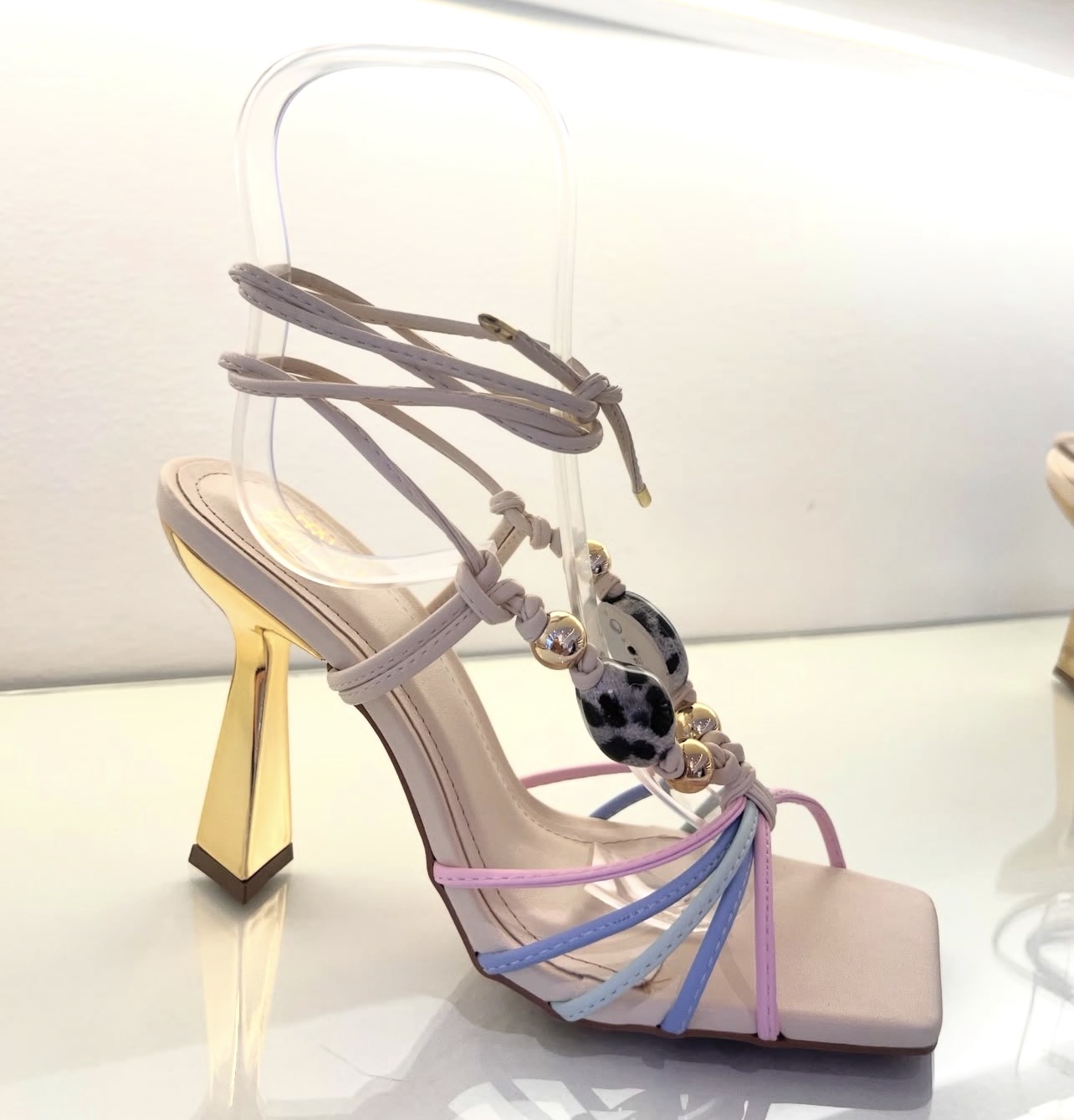 Sandália de salto escultural, com design moderno e cheio de personalidade.